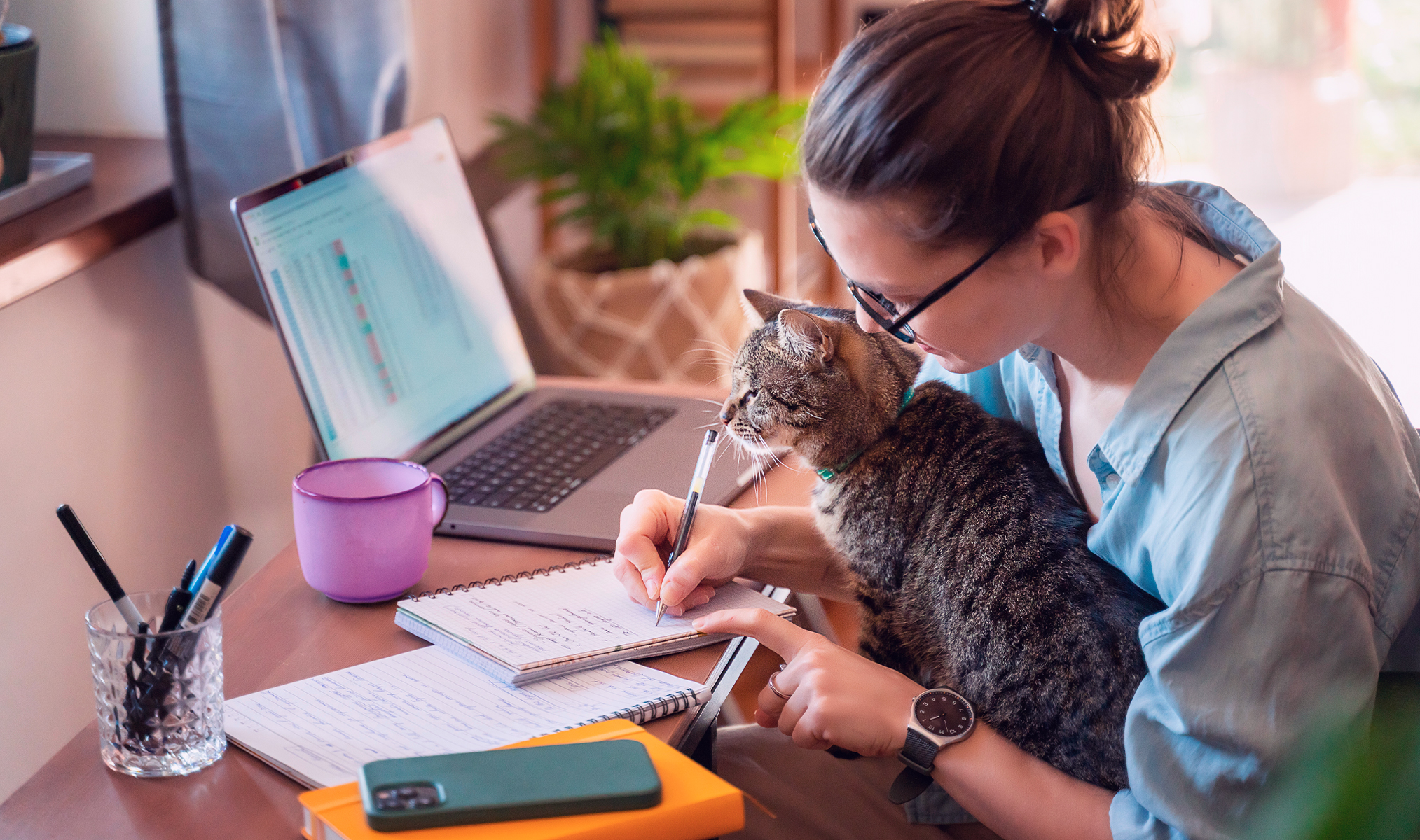 In the comfort of home, an employee and her feline companion embrace the serene flexibility that remote work incentives bring to work and life balance.