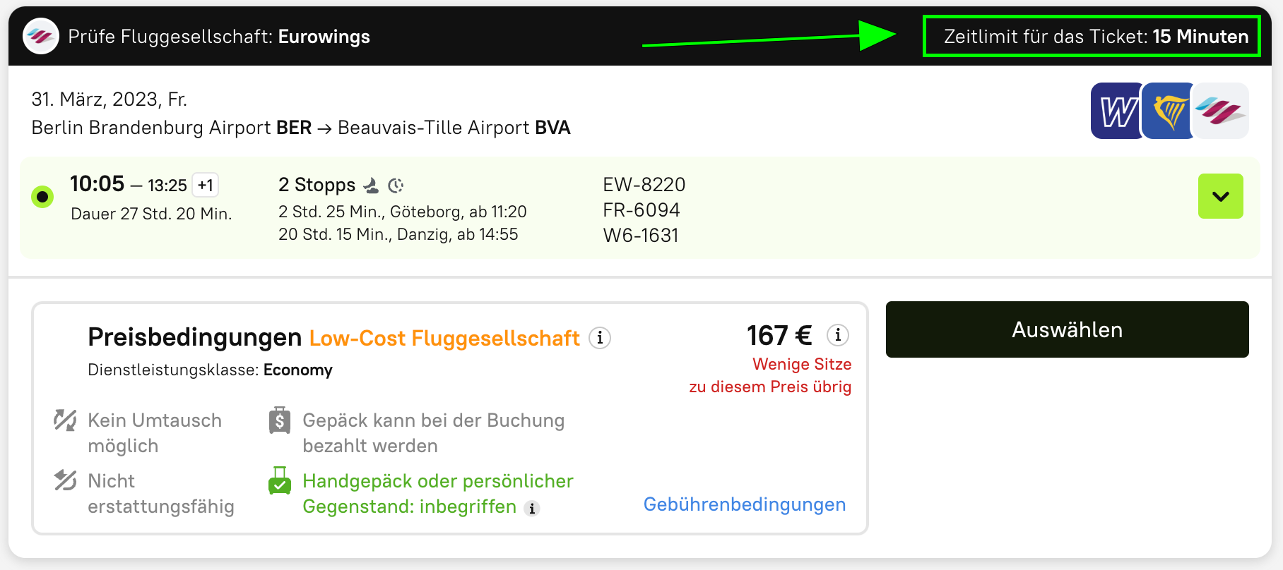 Eine Buchung gilt als storniert, wenn für sie kein Ticket ausgestellt wurde. Um eine solche Situation zu vermeiden, achten Sie auf die Einhaltung der Frist (Zeitraum, in dem Sie Ihr Ticket ausstellen lassen können). Sie können sie in der oberen rechten Ecke der Reiseroutenoptionen nachschlagen.