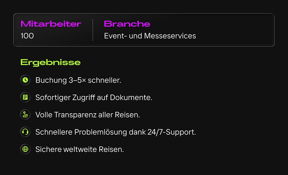 Ohne eine zuverlässige Lösung war die Planung internationaler Geschäftsreisen zu riskant – das Unternehmen stoppte seine Reiseaktivitäten und suchte nach etwas Besserem.