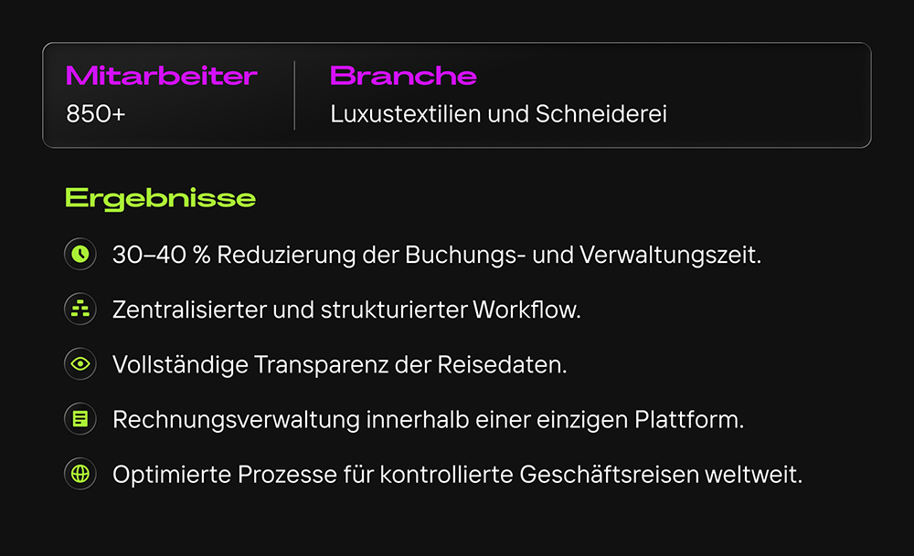 Das Hauptziel bestand nicht einfach darin, Reisen schneller zu buchen, sondern die Kontrolle zu zentralisieren, eine Struktur einzuführen und ein einziges, zuverlässiges System für die Verwaltung aller Geschäftsreisen zu schaffen – und zwar nicht auf Kosten der von einer Luxusmarke erforderlichen Flexibilität.