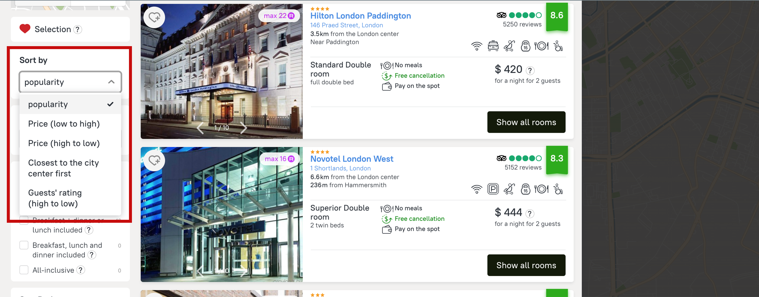 In order to get search results in a useful order, choose a filtering option: by price (low to high or high to low), guests’ rating (high to low), or by distance from the city center, with the closest to the city center first.