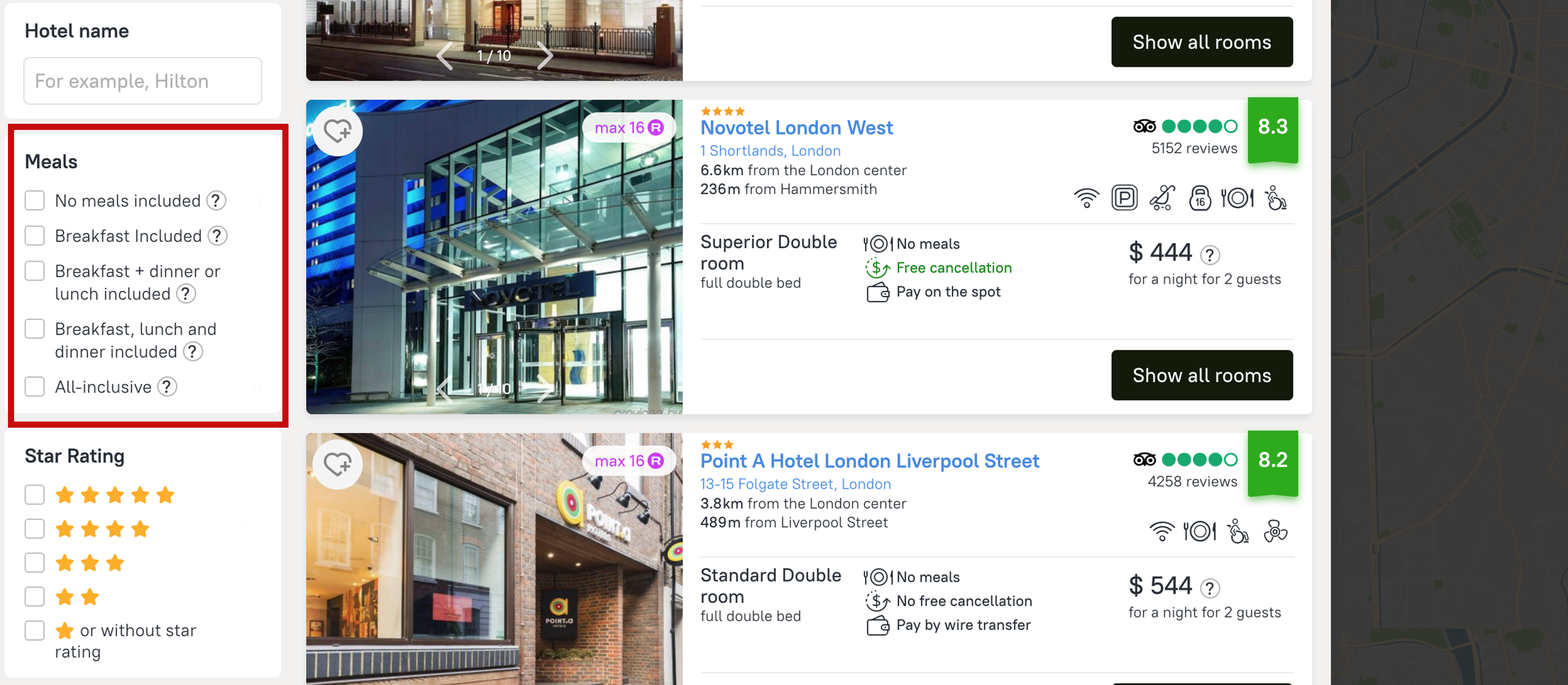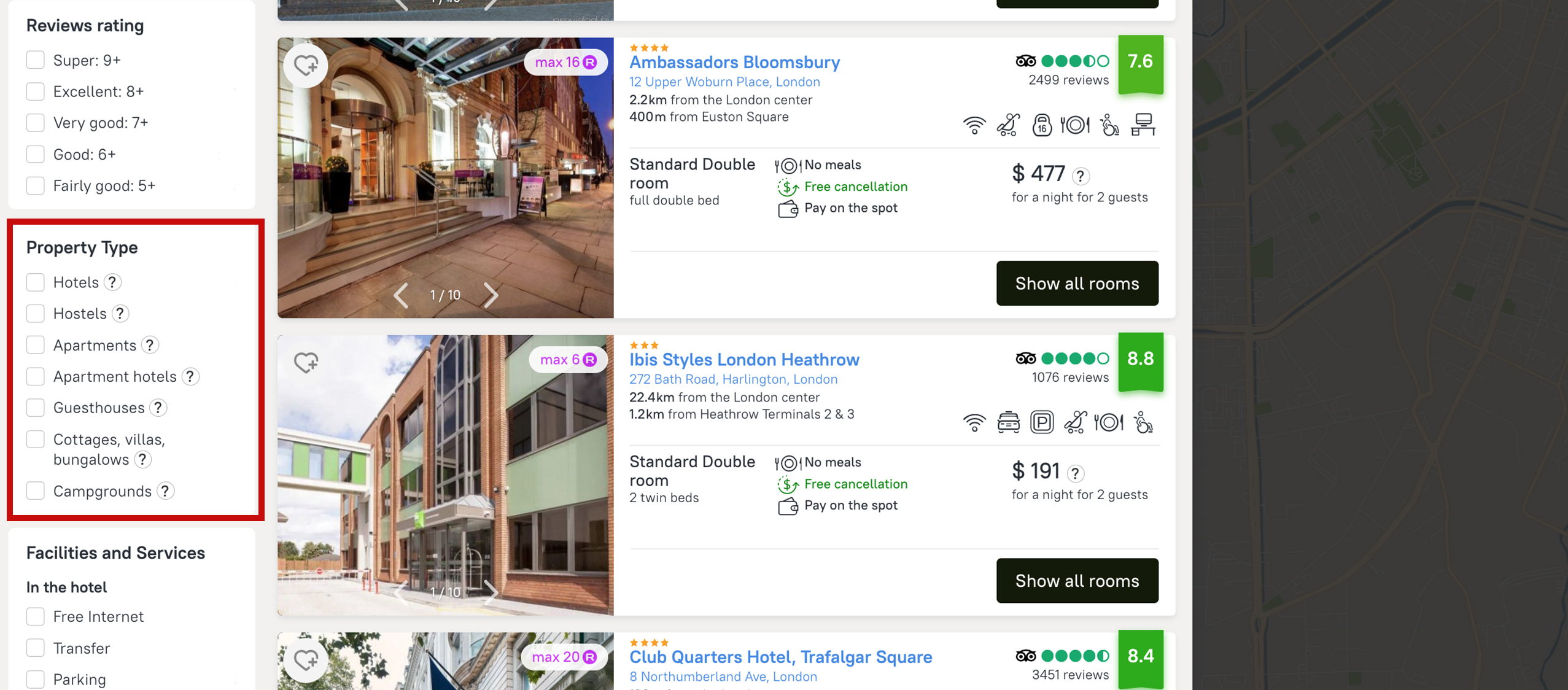 In the room facilities section you can choose whether you need a free internet, a fitness center, a swimming pool to relax after a busy working day. Also you can use a separate filter to select a specific bed type.