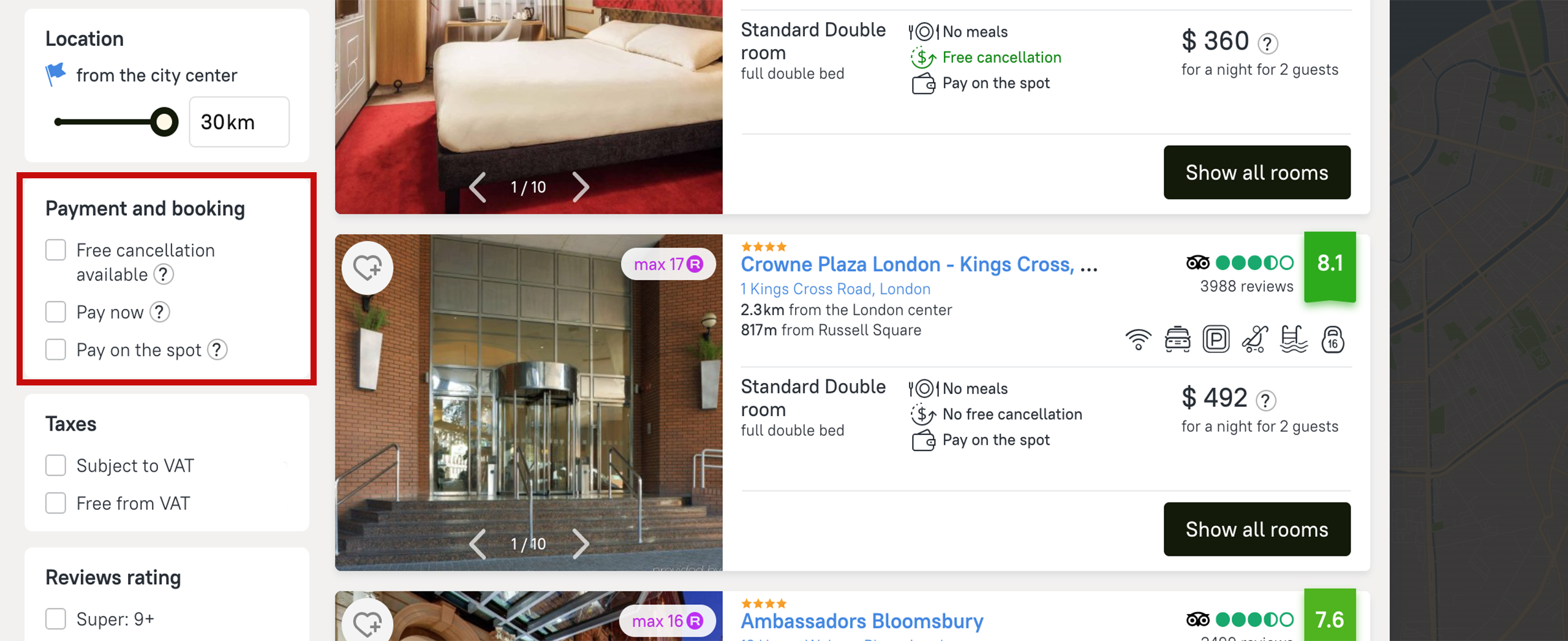 Here you can choose the booking payment option to pay at check-in and whether you can cancel for free.