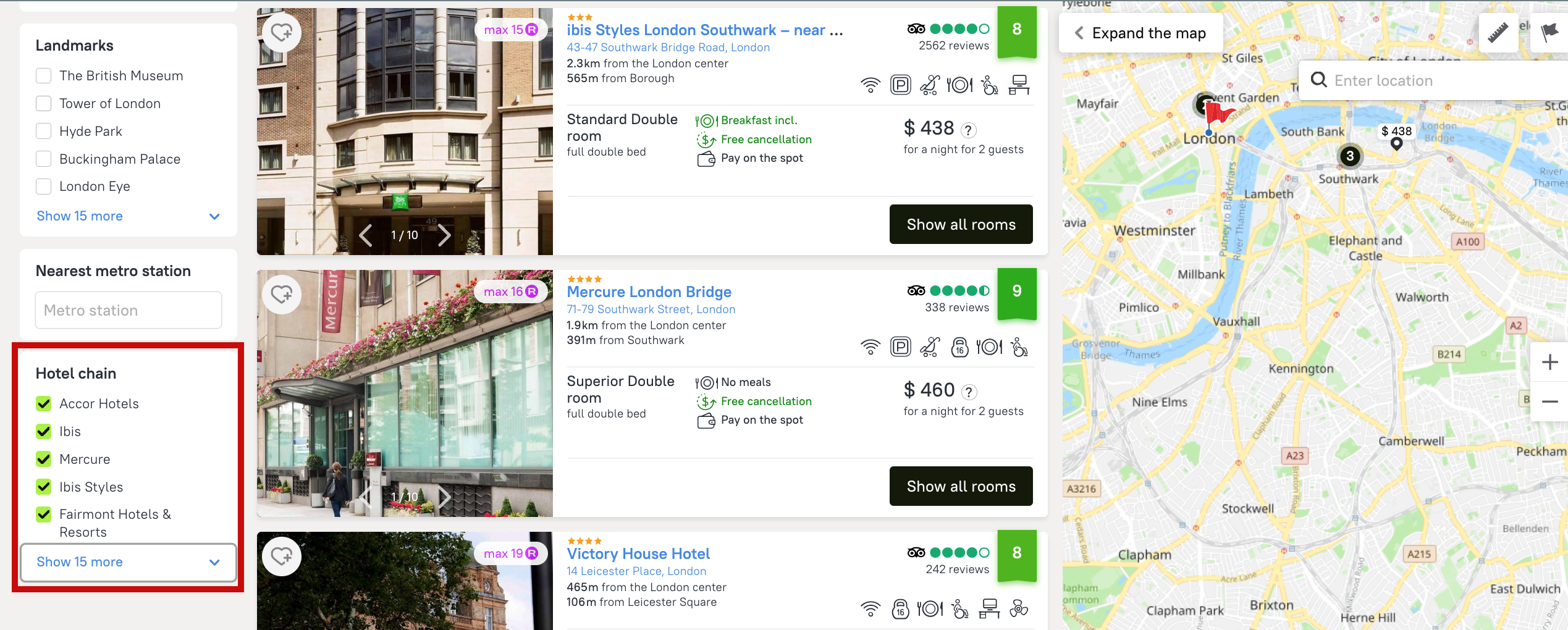 You can find the “Hotel chain” filter on the left, just underneath the “Landmarks” filter. The list of available chains may vary depending on region and priority. To see hotels of one or several specific chains in your search results, just check the box.