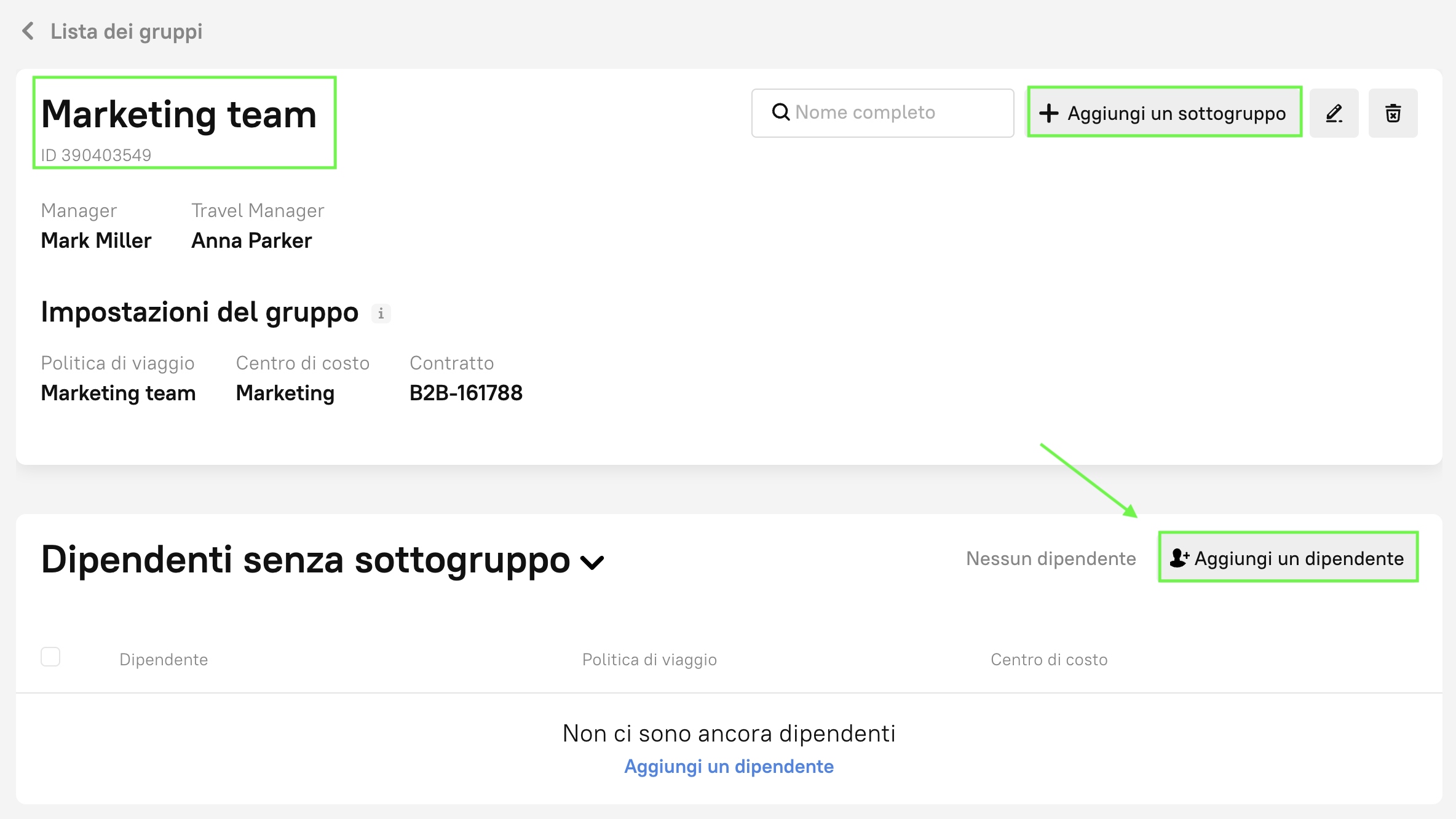 - Puoi selezionare un responsabile per ogni gruppo creato. Il responsabile può prenotare tutti i servizi di viaggio per il proprio gruppo e non vedrà altri repart.