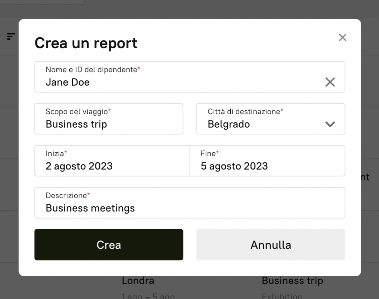 3. Inserisci i dati relativi al viaggio e scegli “Crea”.
