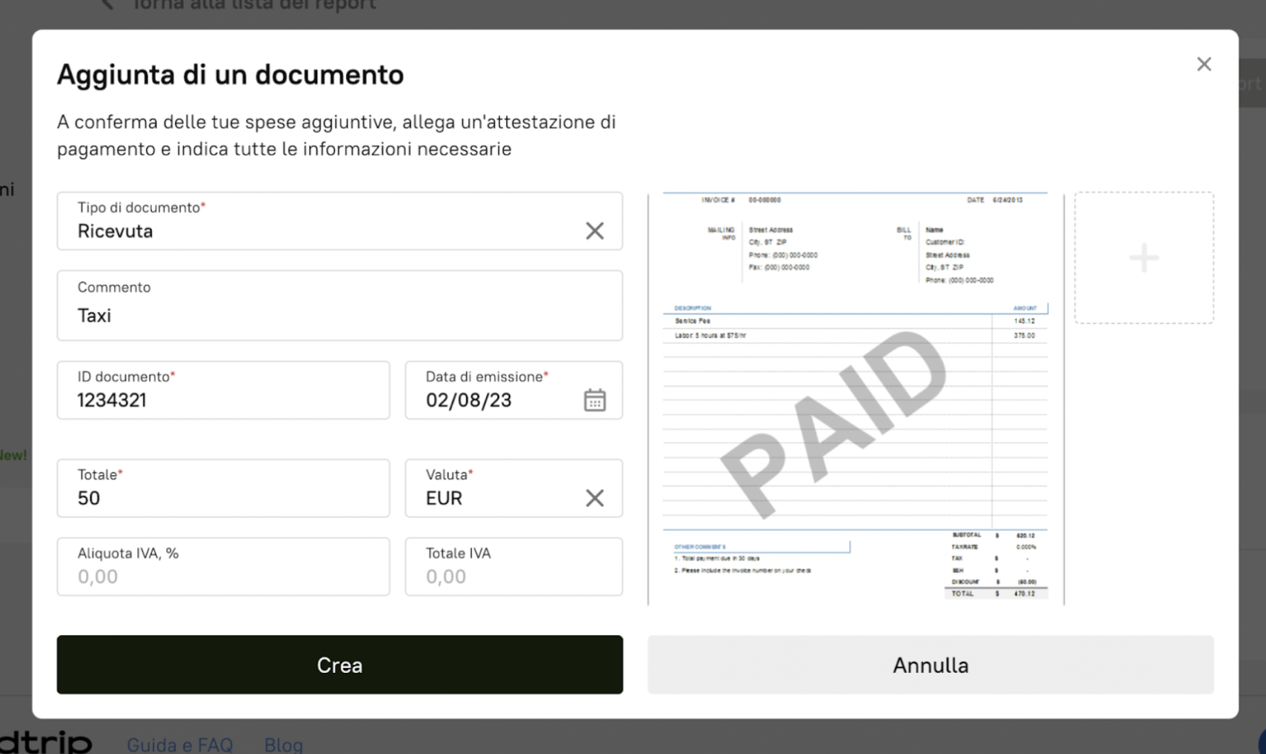 5. Inserisci i dati relativi alle spese e carica la relativa documentazione (ad esempio, la ricevuta). Scegli “Crea”.