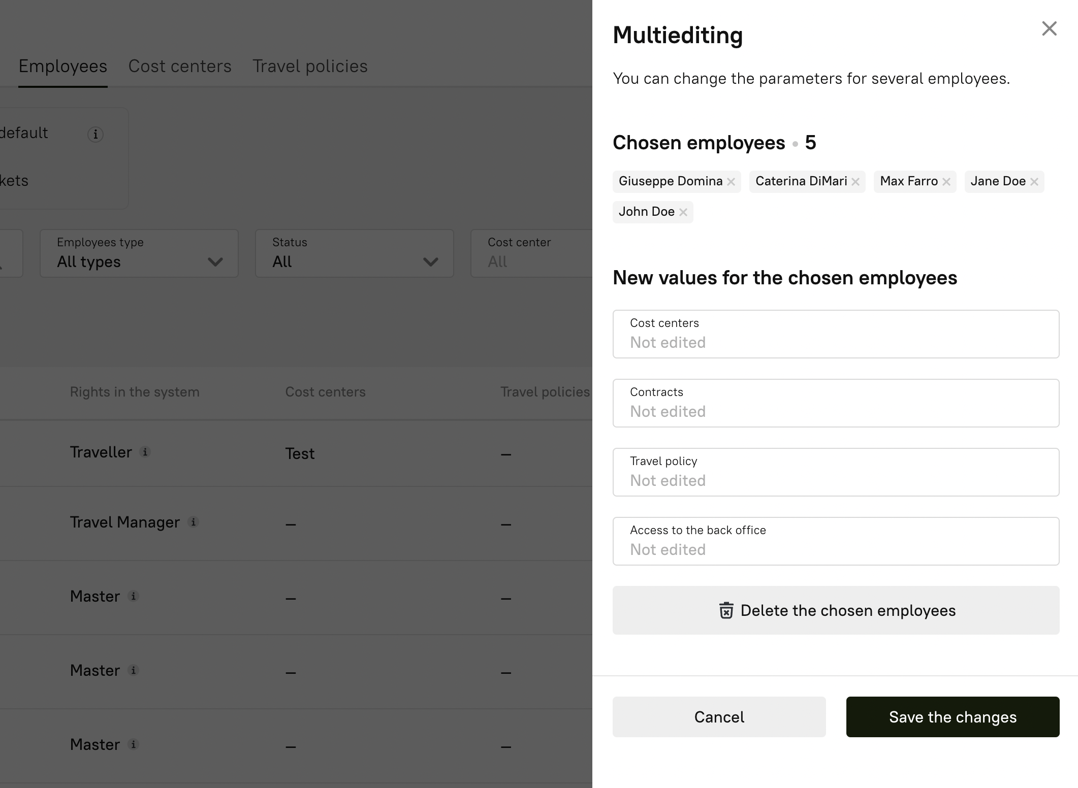 - Change the cost centers or travel policies assigned to employees.