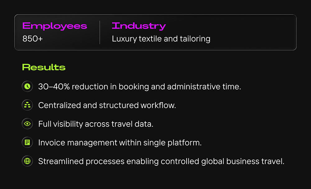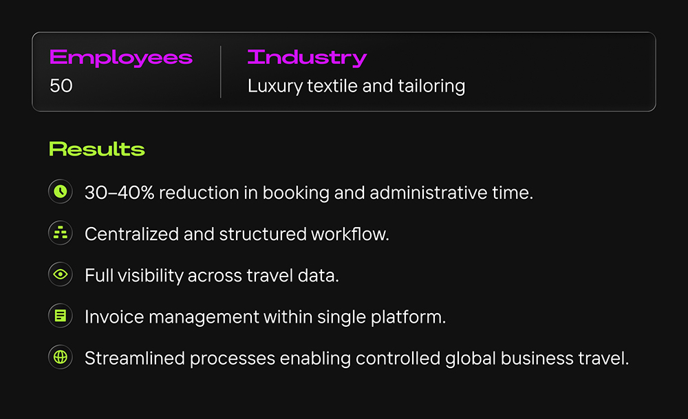 The primary objective was not simply to book travel faster, but to centralize control, introduce structure, and create a single, reliable system for managing all business trips — without sacrificing the flexibility required by a luxury brand.