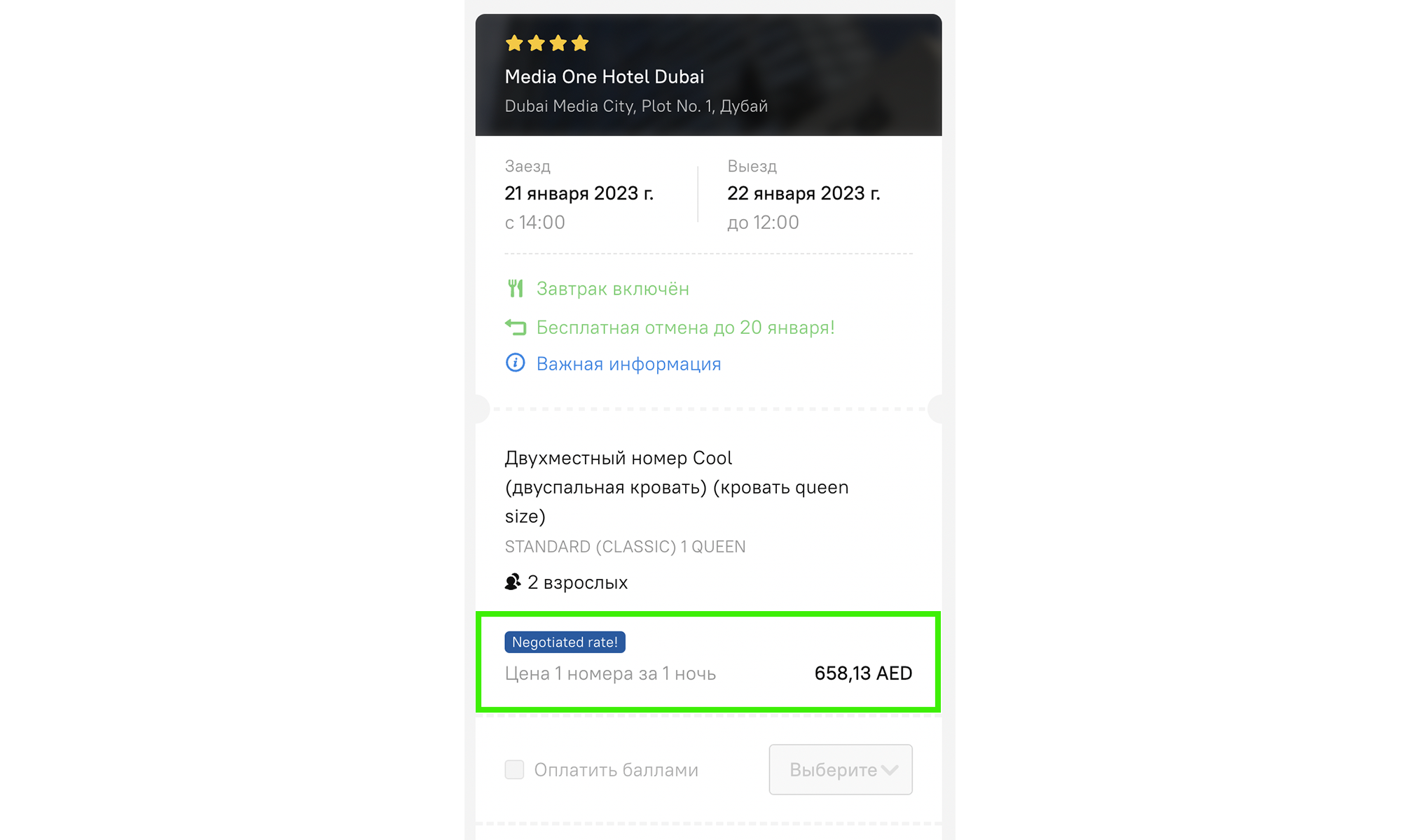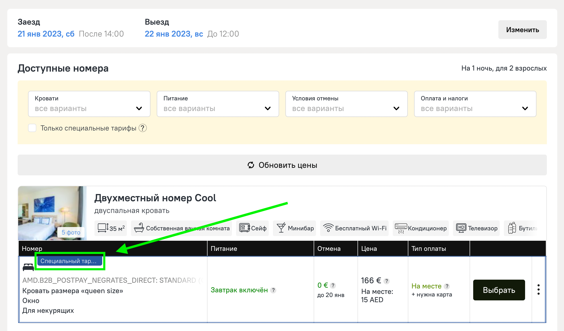 - Выберите специальный тариф — на странице отеля он будет выделен рамкой и флажком.