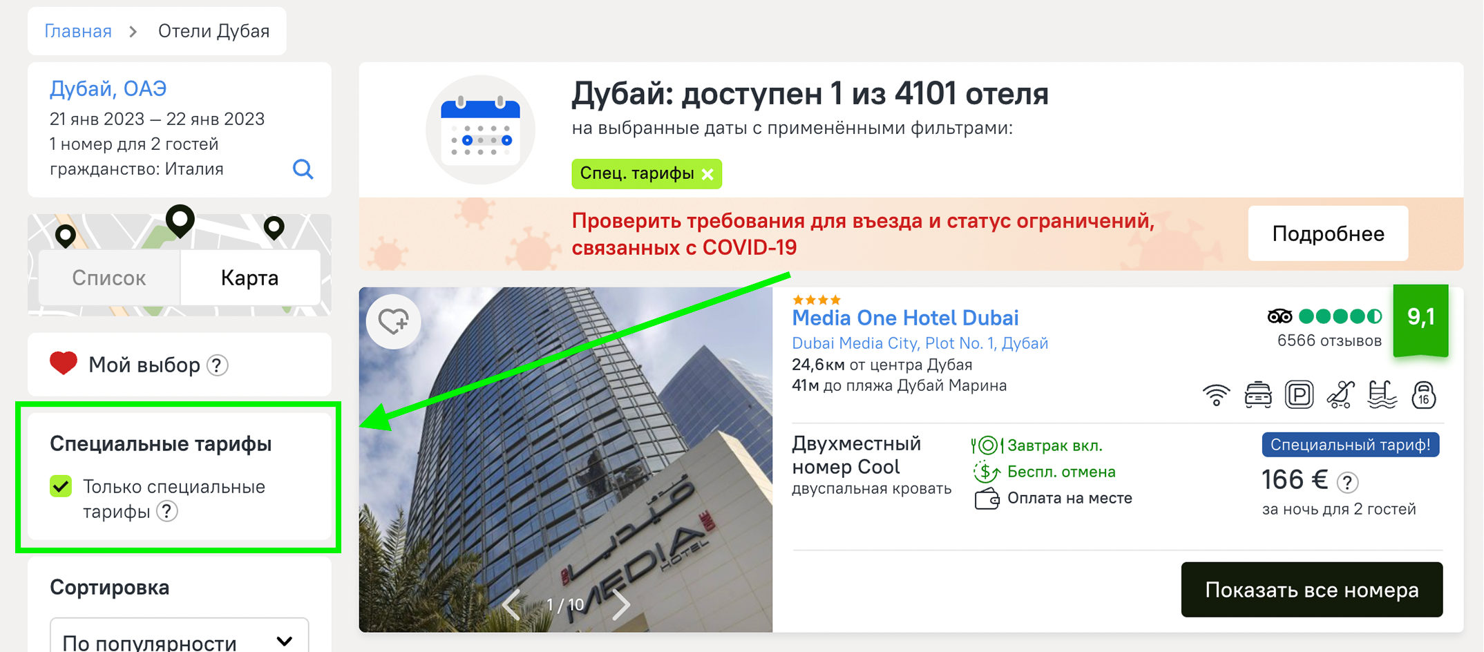 Если вы хотите посмотреть только отели со специальными тарифами, выберите соответствующий фильтр на странице поиска.