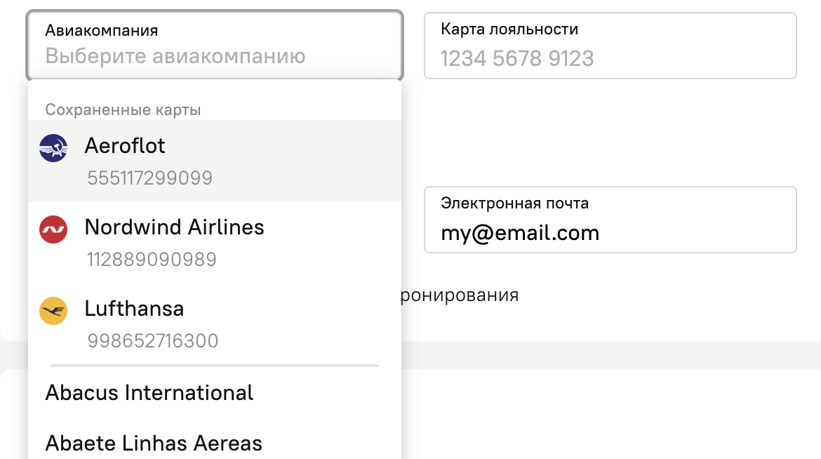Наш сервис прост и понятен в использовании и предлагает множество удобных инструментов, которые помогут автоматизировать организацию бизнес-поездок. Один из них — новая функция автозаполнения карт лояльности при бронировании авиабилетов. Чтобы воспользоваться функцией при заказе, добавьте карту лояльности в профиль или сохраните новую во время бронирования.