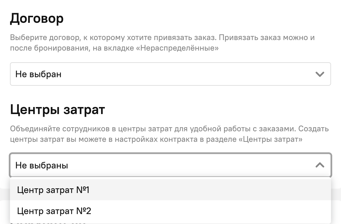 Раньше договор и центр затрат можно было выбрать на странице заказа, теперь они находятся на странице бронирования. Надеемся, так вам будет удобнее ориентироваться и легче распределять бюджет по группам сотрудников.