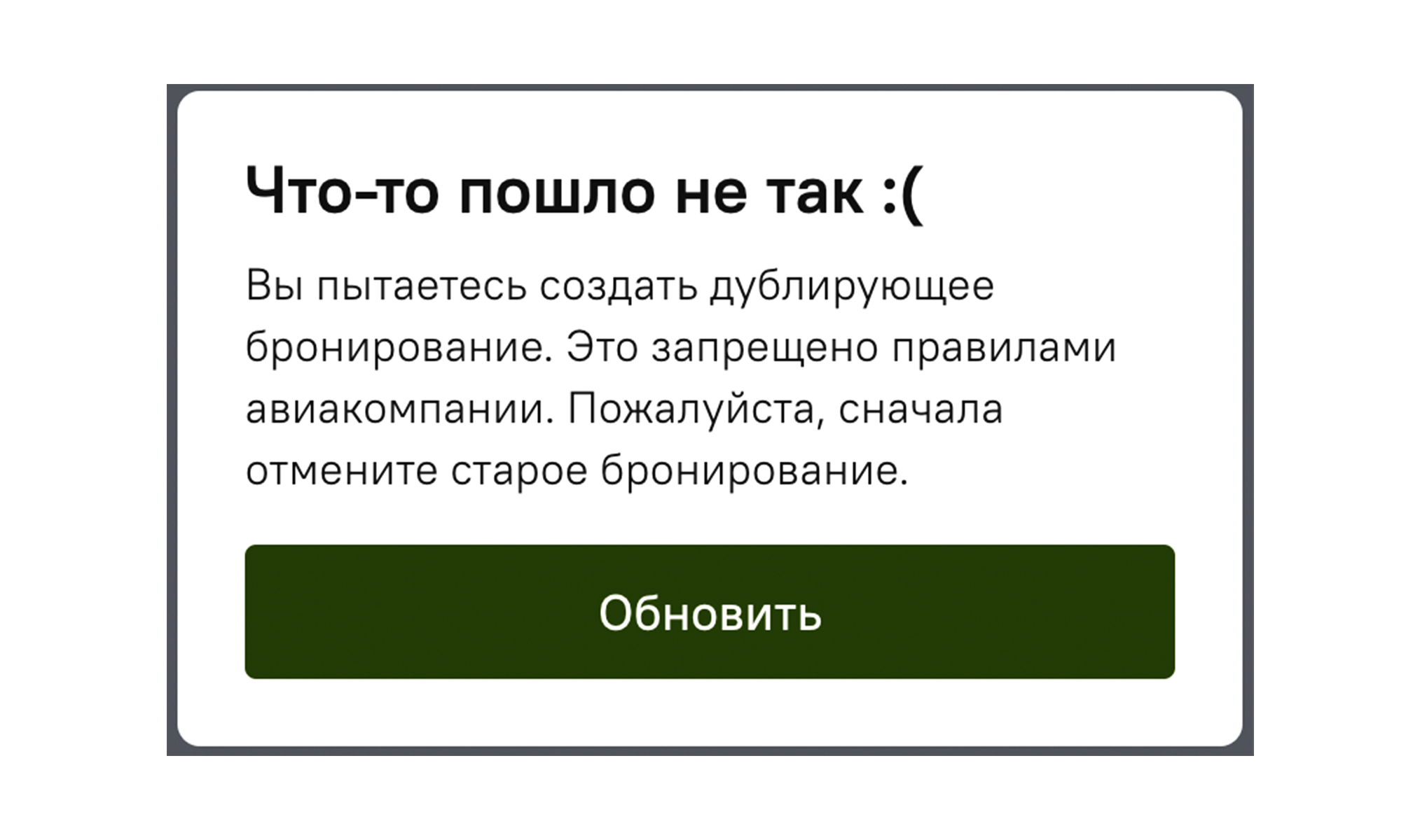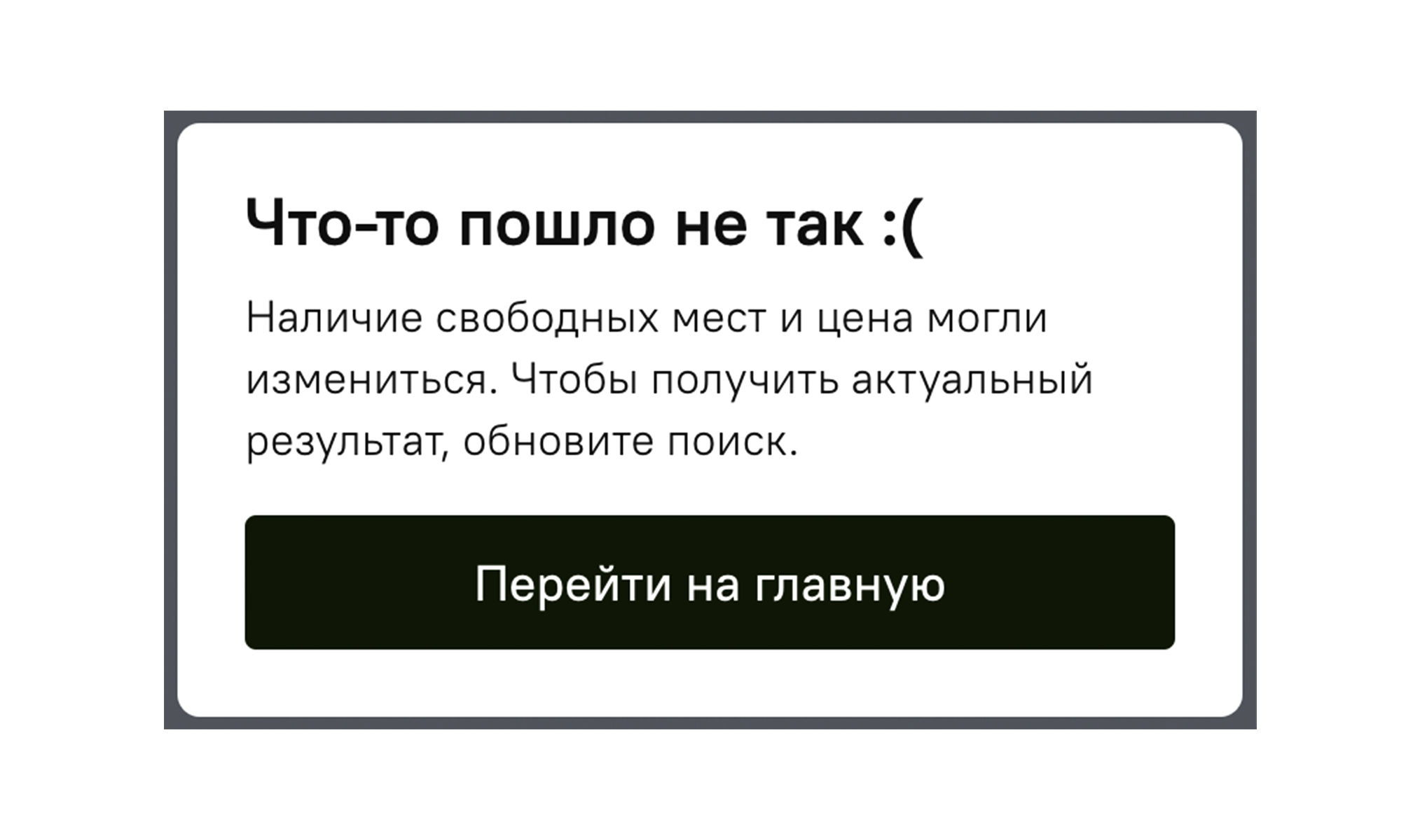 Иногда при бронировании могут возникнуть ошибки, например, когда во время оформления резко изменилось количество доступных билетов. Раньше в таких ситуациях мы показывали стандартный тест ошибки, теперь расшифровываем полученные данные от авиакомпании! Так вы сможете сразу понять, что пошло не так, и главное, исправить недочёт.
