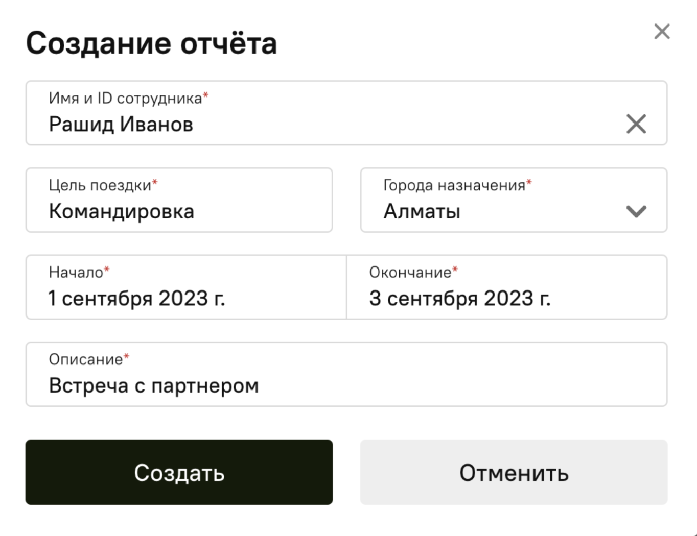 3. Заполните данные о поездке и нажмите «Создать».