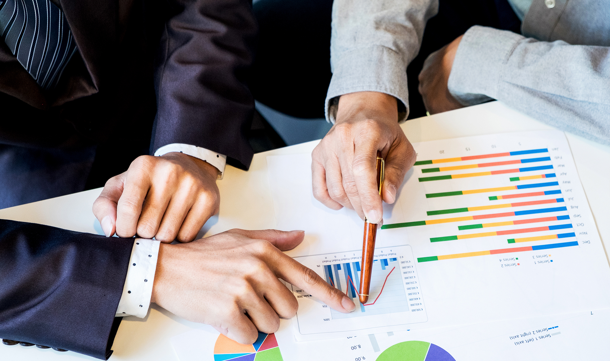 Experts review a travel risk assessment chart, focusing on destination-specific factors like political stability and healthcare to ensure safe business travel.