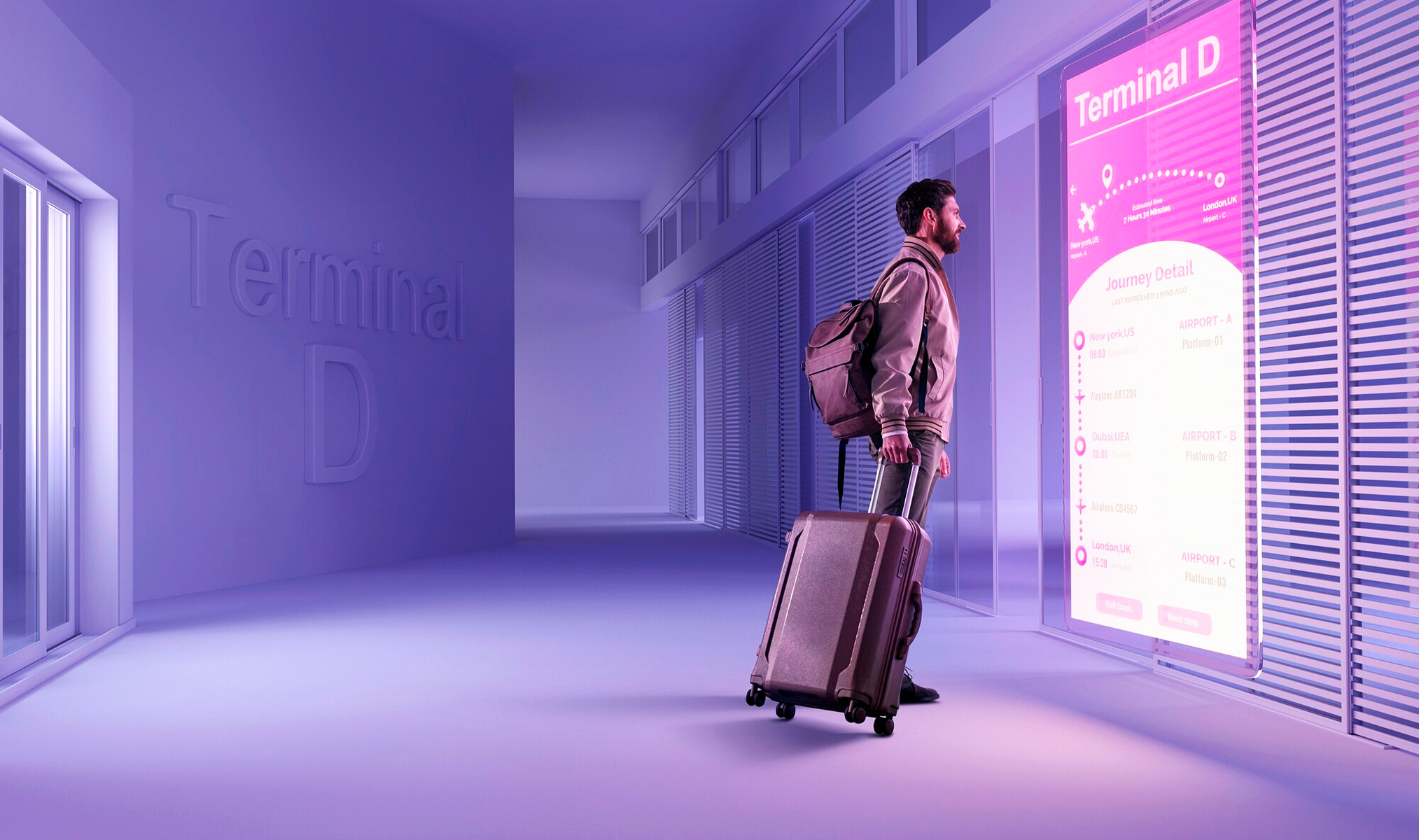 A traveler in the tranquil corridors of an airport, serenely reliant on the ever-present support of a robust travel management system, ready to assist at any hour across the globe.